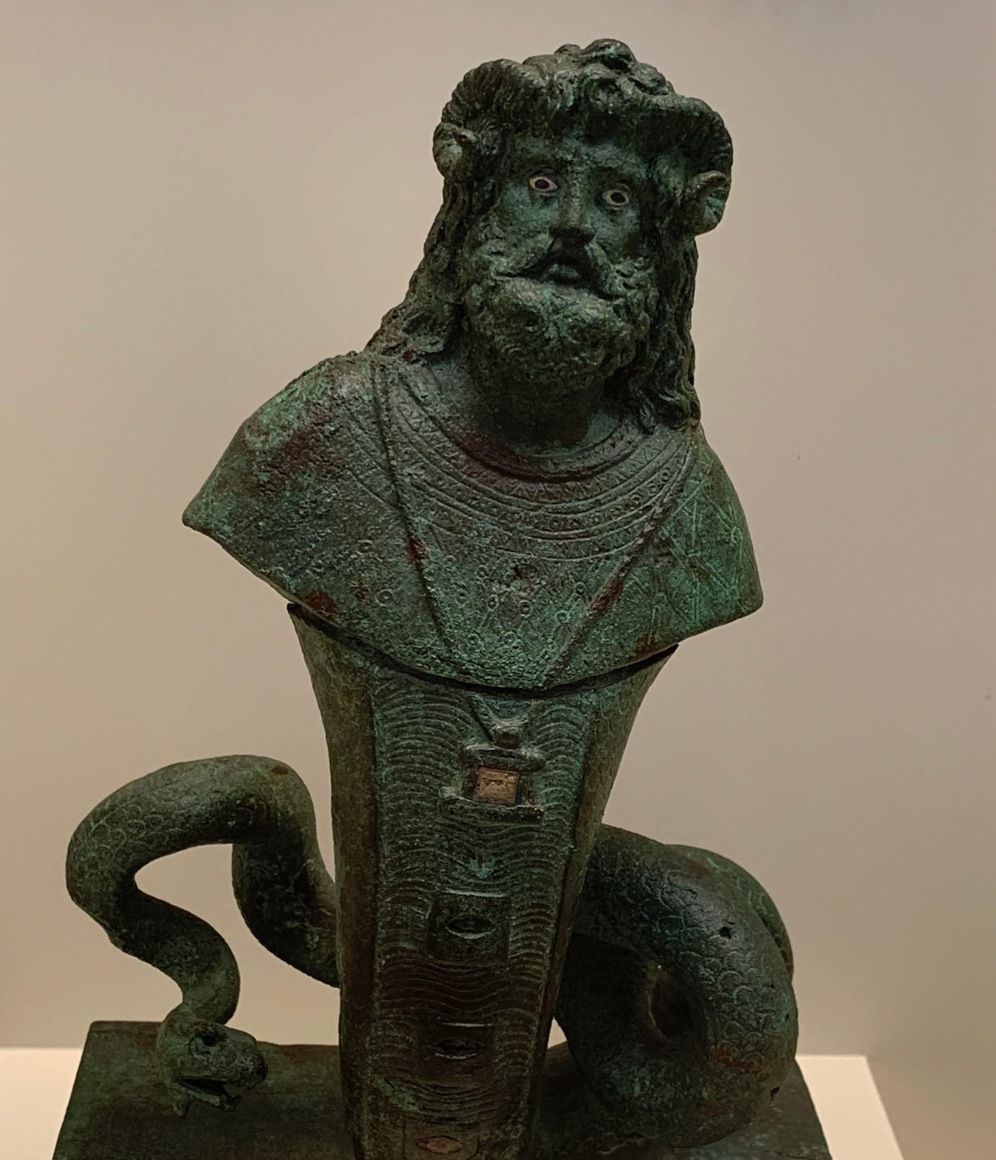 Of course, syncretism (fusing religions) doesn't always work. Serapis is a classic example of how a religious propaganda campaign from before Jesus Christ didn't really work. After the invasion of Egypt by Alexander of Macedon in 332 BCE, the new "Greek pharaohs" intentionally fused Egyptian and Greek theology in an effort to unite the two cultures. During the subsequent reign of Ptolemy I Soter, and later pharaohs, Serapis grew in popularity, but only with the occupying Greeks in Alexandria and then the Romans. Native Egyptians were resistant. In the picture of Serapis below, that's a sacred cobra at his feet, a symbol of royalty and the divine.