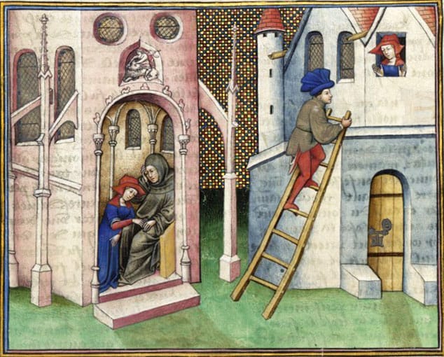 I would enjoy any book that is about romance and female infidelity, in the sense that such stories are usually about female empowerment. I also like VII: 2, about a quick-witted young woman named Peronella who has sex with her lover behind her husband’s back. And IX:6 (shown below), a comedy of errors (and sex), which was derived from the fabliau Gombert et les deus clers ("Gombert and the two clerks") by Jean Bodel (1200's) and which Chaucer adapted as The Reeve’s Tale.