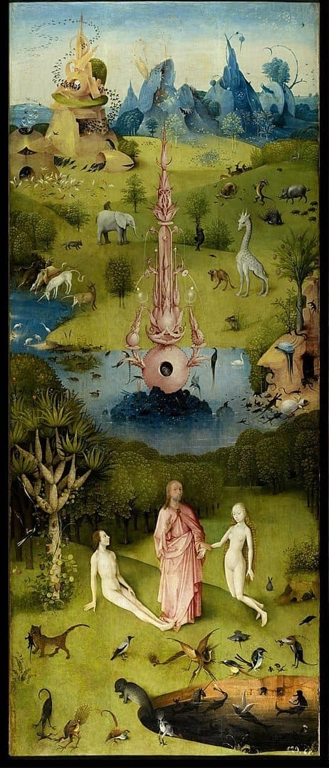 Shown below is the left panel of the triptych known as The Garden of Earthly Delights, by Hieronymus Bosch. This panel is The Garden of Eden, or Joining of Adam and Eve, by a not-yet-born Christ. But, you just know the forbidden fruit is next: look at all those people in the central panel having sex! Indeed, the Dutch title is more revealing: De tuin der lusten, literally "The garden of lusts."