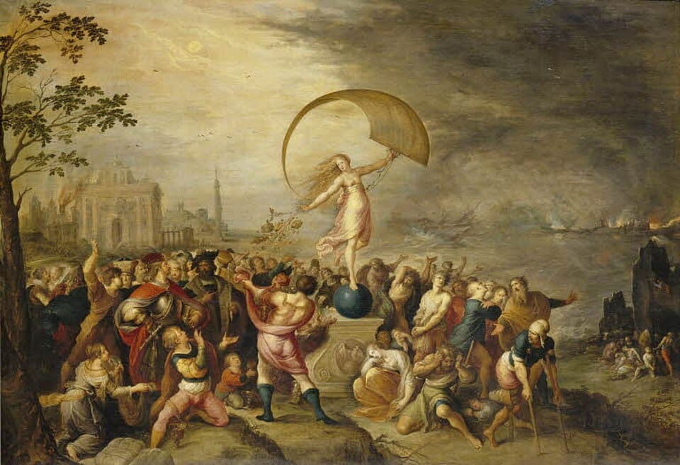By this time, Dame Fortune had become associated with the Age of Discovery, for example the painting below, Allegory of Fortune (Fortune Marina), by Frans Francken the Younger, circa 1615-1620 - the ocean, the sail, the globe beneath her feet.