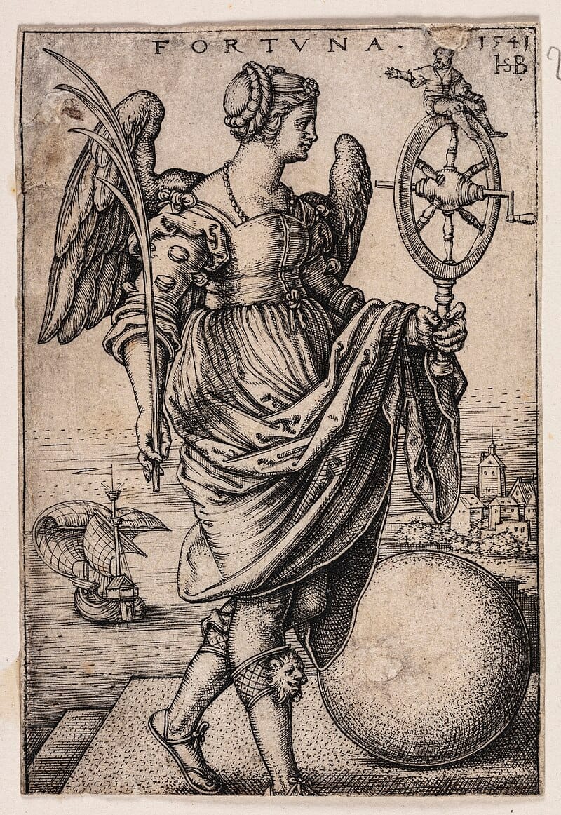 Below is an illustration of Dame Fortune for Boccaccio's influential De Casibus Virorum Illustrium (transl. as "On the Fates of Famous Men" or informally as "The Fall of Princes"). This work was written in the late 1350's and it influenced Chaucer (The Monk's Tale) and anticipates Machiavelli's The Prince, except it is medieval and gruesome, where The Prince is neither. This illustration is from a 1467 French version of De Casibus Virorum Illustrium, by the Coëtivy Master - see the Getty Museum for more of his illustrations.