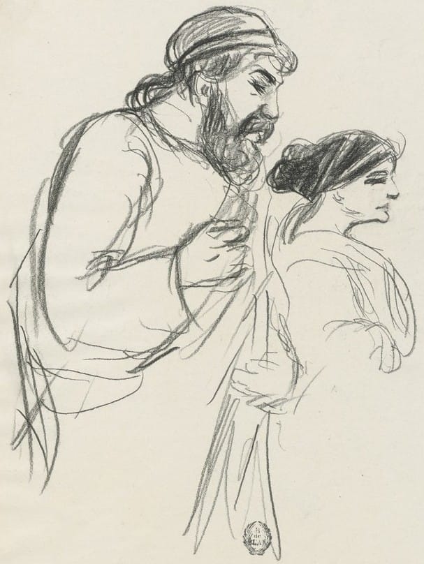 This (cropped) drawing below is just as honest about how the couple may have actually looked in late middle age. It's by Paul Charles Delaroche for an opera by Gabriel Fauré - Pénélope - staged in Paris in 1913.