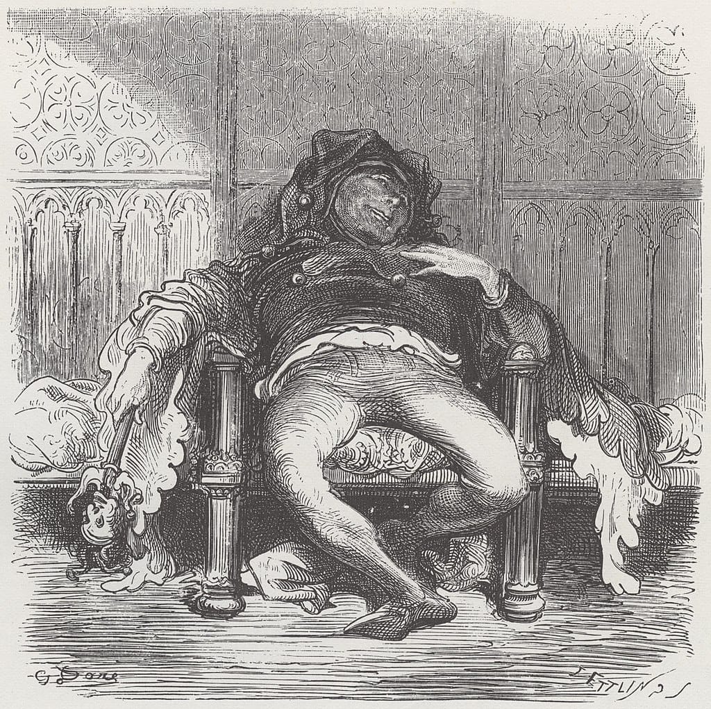 The other court jester I like is Triboulet, a more traditional French jester, also from the 1500's, who is more of a composite of different jesters. He is fascinating mostly because of how many literary characters he inspired, including an appearance in Rabelais' Gargantua and Pantagruel (below) and as the hero of Victor Hugo’s 1832 play, Le roi s’amuse. That play was banned after just one performance for its satire of the monarchy and aristocracy, which just goes to show that dictators do not, in fact, have a sense of humor. He then appeared in Verdi’s opera adaptation of 1851, Rigoletto (here).
