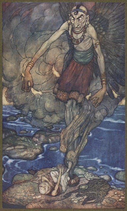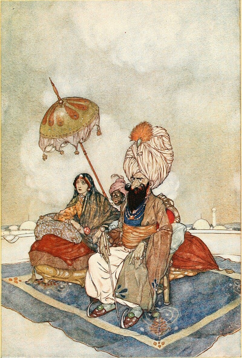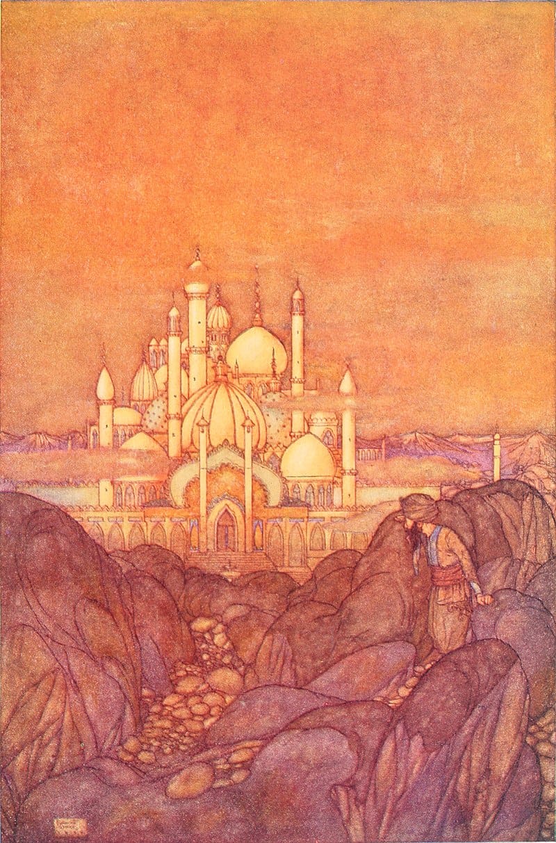 Immediately above (and below) is Edmund Dulac's illustrations for Stories from the Arabian Nights (1907). Up top is Disney's Agrabah in Aladdin - clearly an homage. Dulac was a French book illustrator whose heyday was in England in the years before World War I. He produced his whimsical flights of fancy for many books, including Edgar Allan Poe's poems and fairytales such as Beauty & the Beast.