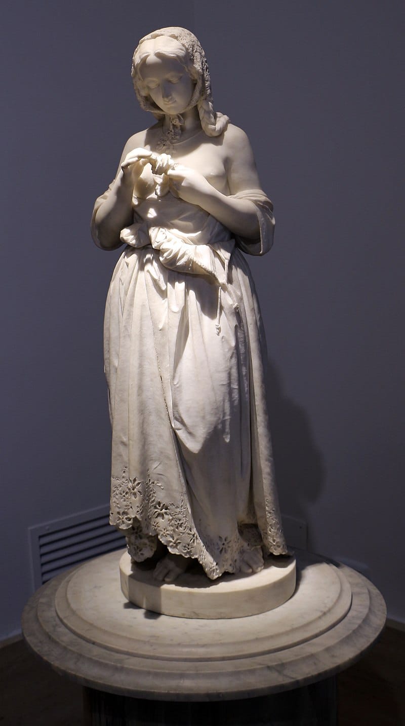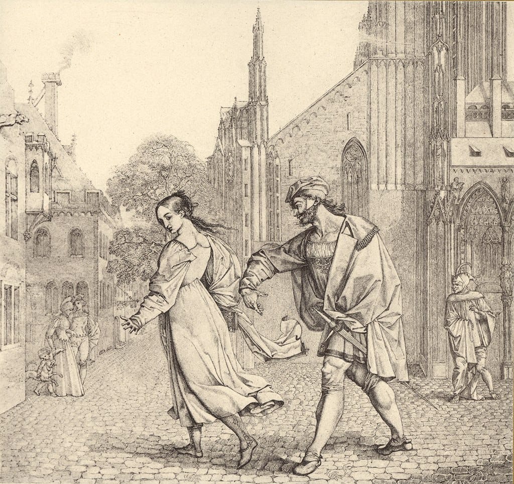 The other traditional Christian view is that, no, Gretchen is innocent and pure, a natural and feminine young woman who is corrupted by Faust, a selfish man in the grip of his lust and ambition. Many painters do allow that Faust may have been in love with her, which maybe lets him off the hook, Ary Scheffer for instance: