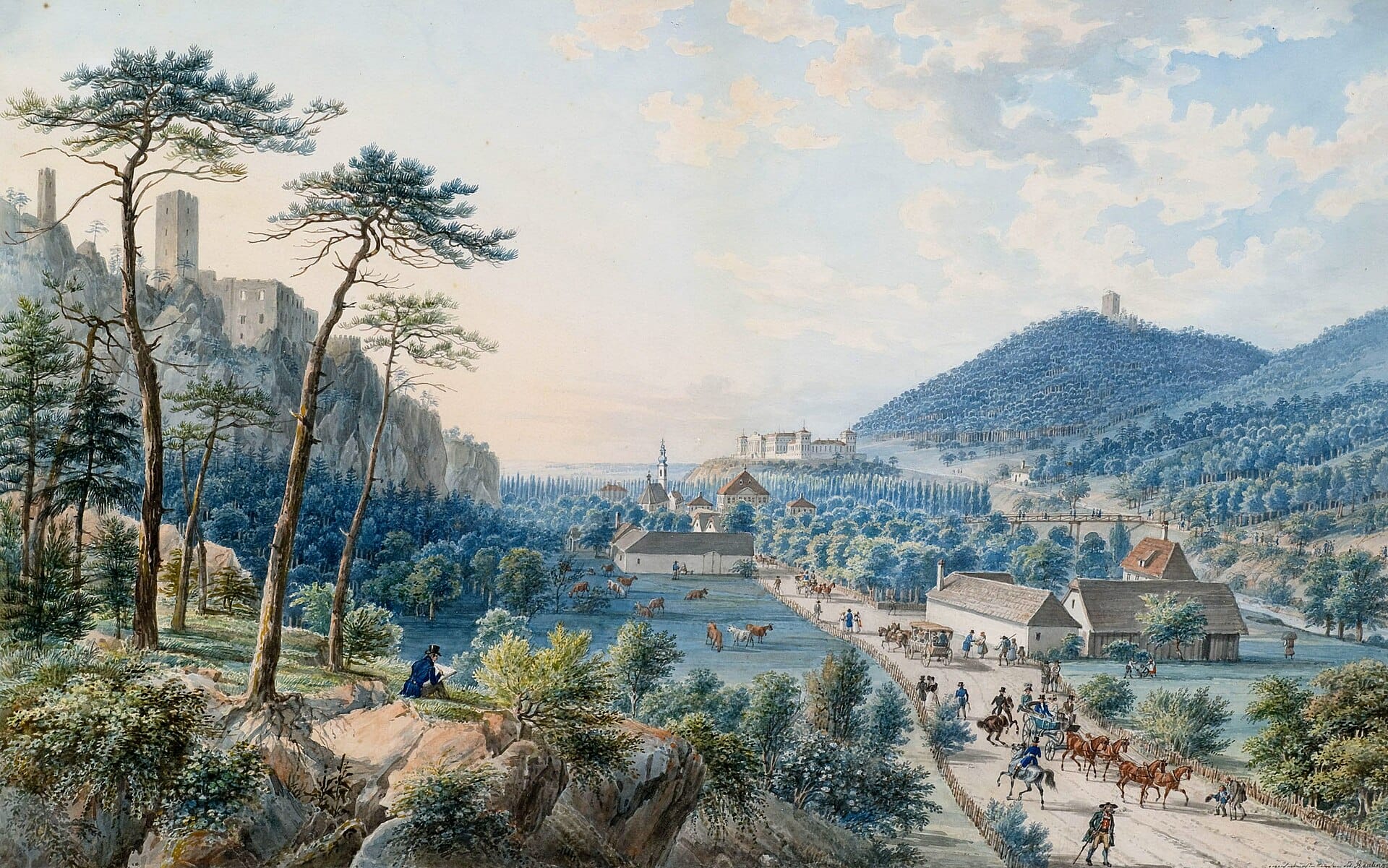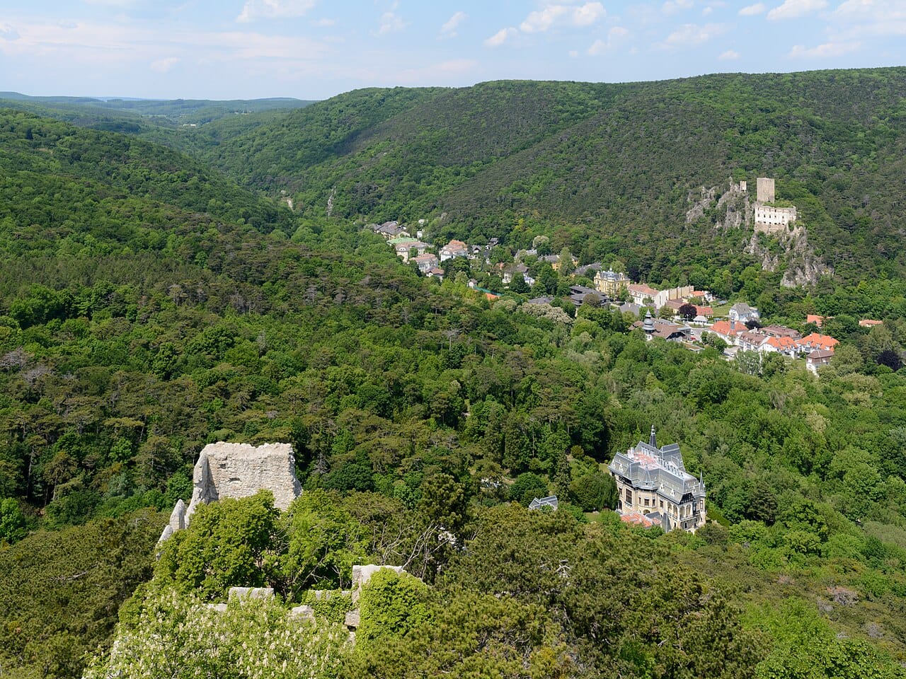 Leaving Baden bei Wien, you first might have passed the royal palace Schloss Weilburg, built between 1820 and 1823, in the paintings below (from 1885 and before 1839 respectively) and a recent photo. The palace was burned to the ground in 1945. Then you encounter the ruined castles of Rauheneck (the hill on the right) and Rauhenstein (the hill on the left).