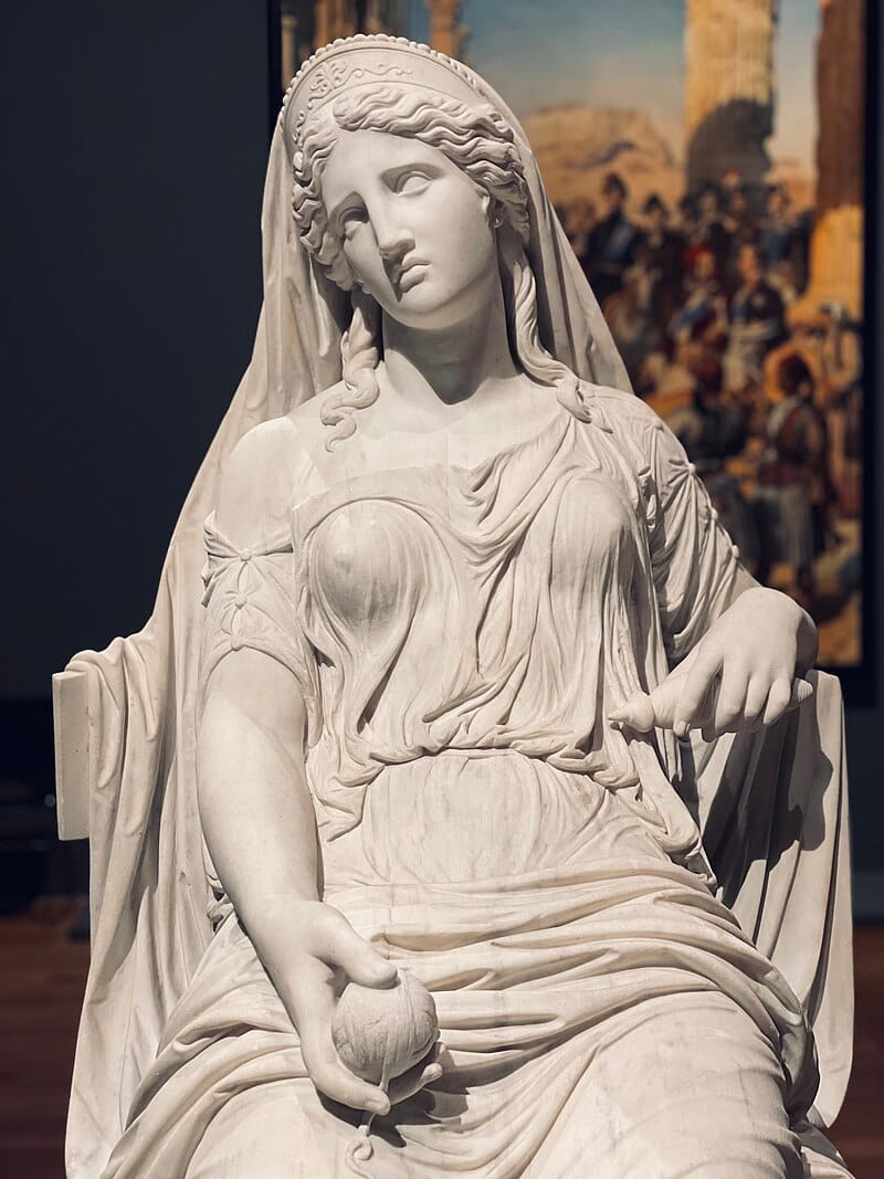 The Museo Pio-Clementino is one of the sculpture museums in the enormous Vatican Museum, and it showcases works of Greek and Roman sculpture. This statue of Penelope is a Roman copy of Greek original. According to one expert, "the copyist has exchanged the stool of the original for a rock and has given the figure the face of an androgynous youth." She is shown in the pose of the thinker, which historically is how she has been portrayed from Homer onwards, as she grapples with the nightmare thrust upon her and her need to be strategic and survive.