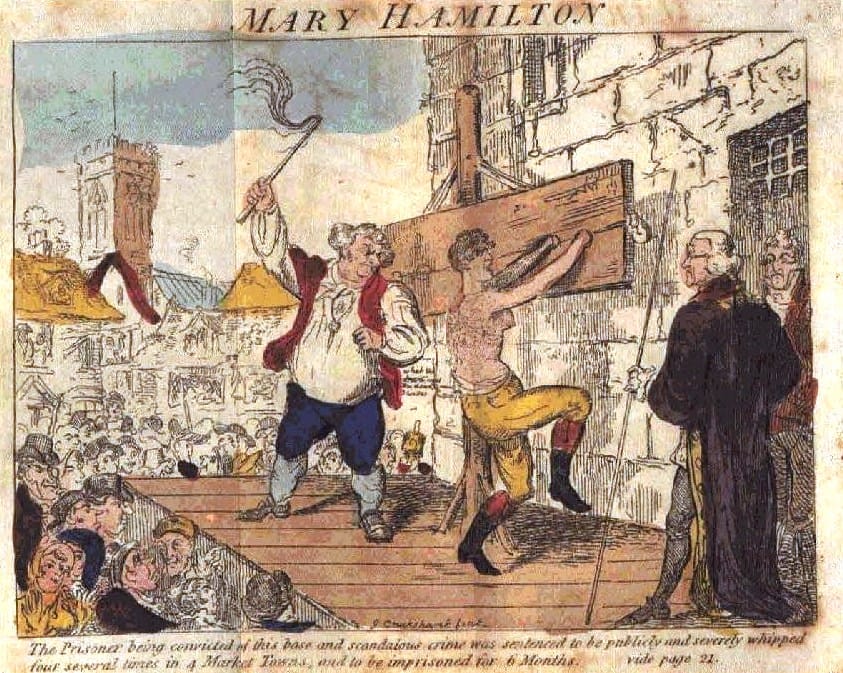 Henry Fielding (of Tom Jones fame) anonymously published a satirical pamphlet The Female Husband in 1746. It was based on a true story about a woman, Mary Hamilton, who lived as a man and had a number of lesbian marriages. One bride eventually caught on (ya think?) and Mary was convicted of fraud, not sexual immorality, let alone bigamy. She was punished with six months in prison and a public whipping. Fielding reveled in it as a pot-boiler and later it became a salacious play - the image below is from an 1813 edition. More on this story here.