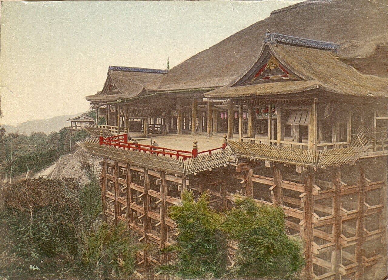The verandah in the picture above is famous for a saying in Japan - "A leap from Kiyomizu" - meaning jumping off this verandah, signifying a leap of faith (the jumping is now illegal). Below is a postcard from 1909 which better reveals just how tall is the wooden structure the main temple sits upon.