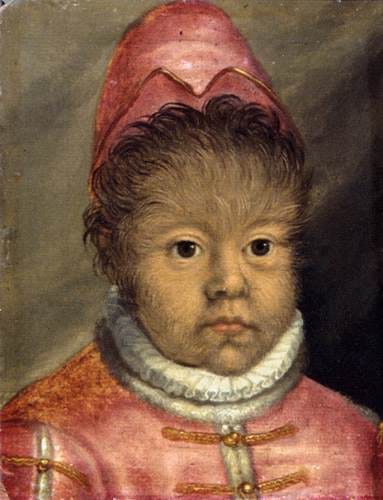 The family traveled around the the courts of Europe where they were feted and, although they were obviously objects of curiosity, it was a time when God had a purpose for all his creatures apparently, and scientific and medical hostility was restrained. When the family was in Austria, the family sat for portraits like the ones at the bottom of this page, which are now in the Schloss Ambras, Innsbruck. Wikipedia identifies the first one as The Daughter of the "Hairy Man from Munich" - showing Maddalena (Madeleine), the eldest daughter of Petrus Gonsalvus the "Hairy Man" which, I assume, is how they were known outside the royal court. The second shows Henry Gonsalvus. The painter is unknown.