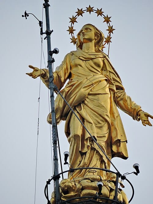 Milan is the city of la Madonnina>?, a symbol for the city: a statue of the Virgin Mary atop the Duomo, erected there in 1762, designed and built by Giuseppe Perego. The statue gives its name to the derby between Inter Milan and AC Milan.