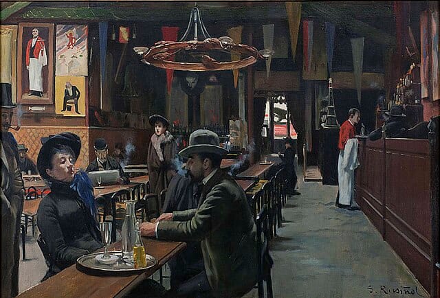 Below is a more amusing image, Café des Incohérents, Montmartre by another underrated Catalan painter and poet, Santiago Rusiñol, from around 1890 - amusing because he is gently mocking the drabness - more truthful that the color and energy of others' paintings.