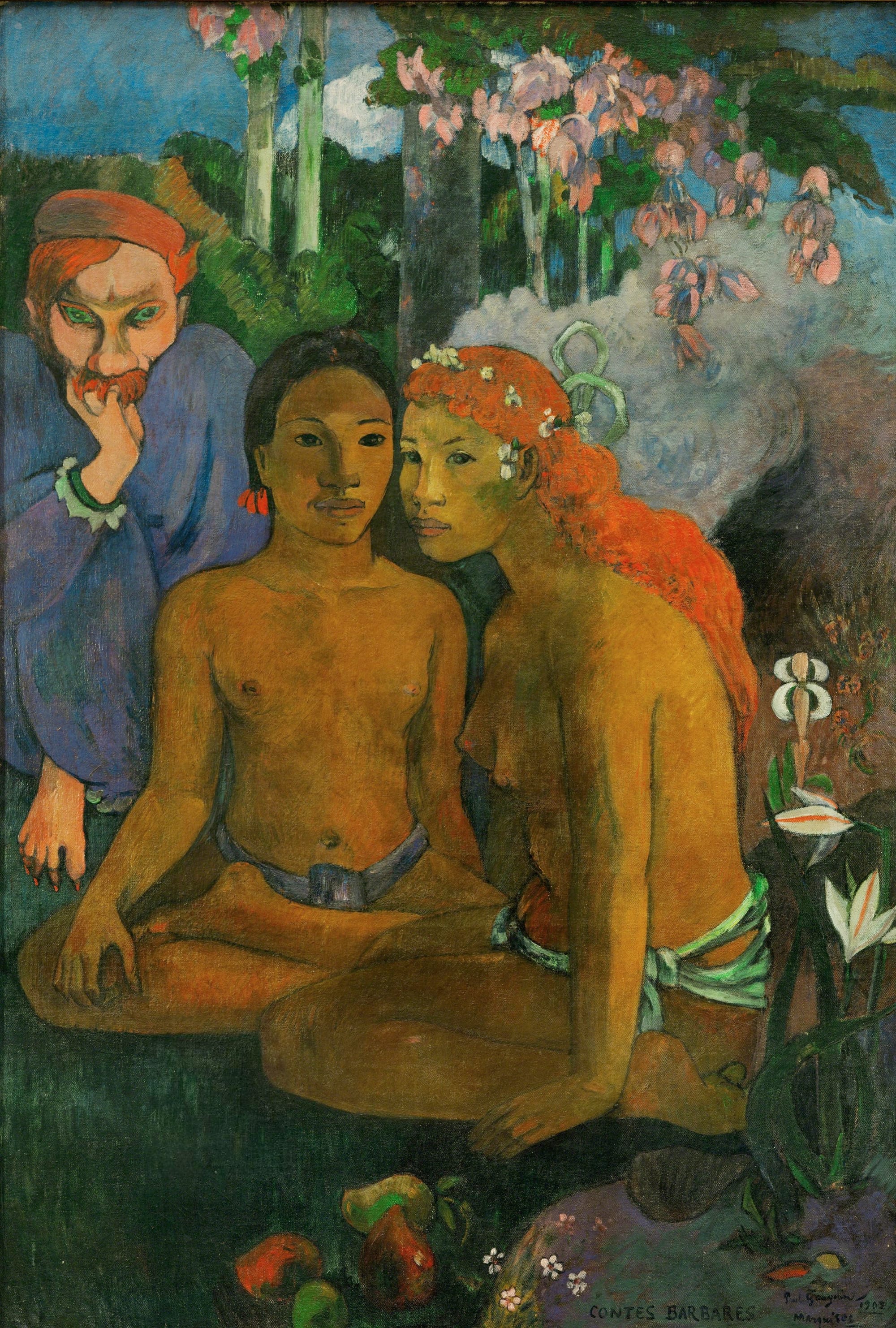 This is one of Gauguin's last paintings before his death from syphilis in 1903 and it's one of his best. Titled Contes barbares, "Exotic Tales" may be closest to the mark for Gauguin is satirizing European (and his own) fascination with these Tahitian women by crushing the man into the backside of the picture. Interestingly, the man resembles an incubus - perhaps a comment on colonialism too?