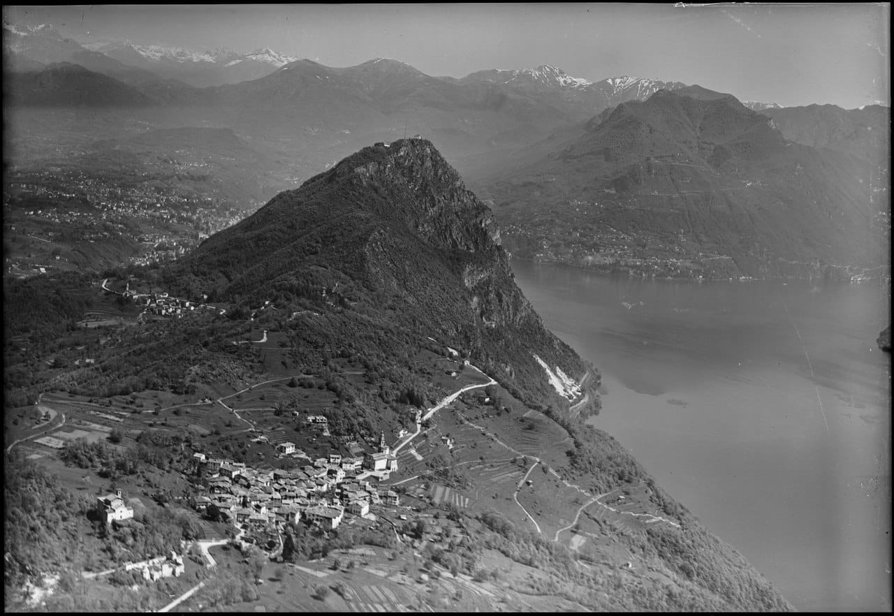 The above quote is from The Glass Bead Game. The novel, which he started writing in 1931, won him the Nobel Prize for Literature in 1946. In a way though he is echoing Nietzsche's condemnation of Wagner's music before the War as much as forging a new jeremiad about cultural ennui after it. More on this here. Below is an aerial photo from 1954 of Monte San Salvatore by Lugano, Switzerland. Hesse lived most his life near here in the village of Montagnola, to the left of this photo.