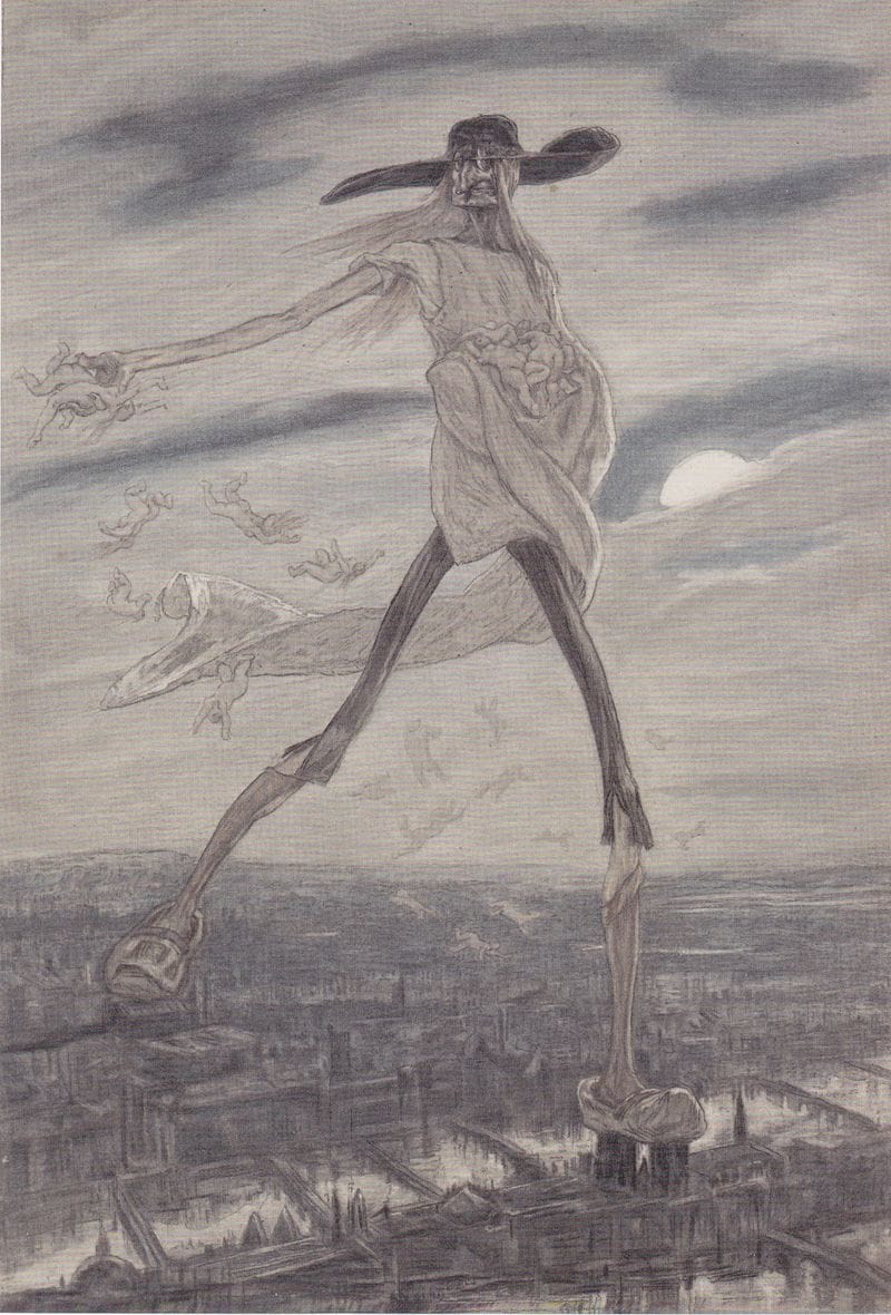 My favorite Rops illustration is below: Satan Sowing Seeds from his Les Sataniques series (1882). Looks like that's Paris down there and he's dropping sexy women. Love the clogs. One of them seems to be on Notre Dame.