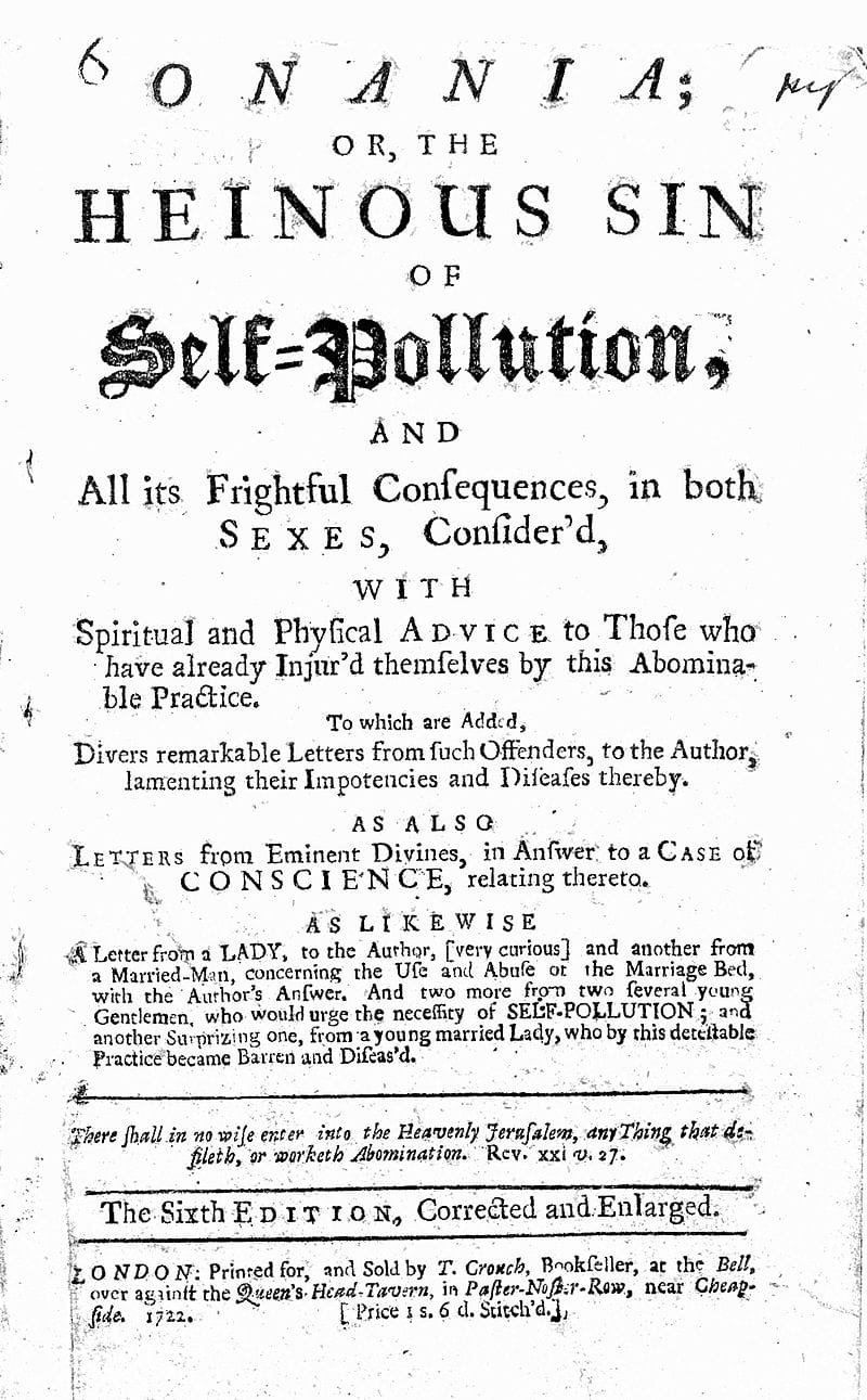First - above - there was the exquisitely titled anonymous pamphlet of 1716: Onania; or, The Heinous Sin of Self Pollution, and all its Frightful Consequences, in both SEXES Considered, with Spiritual and Physical Advice to those who have already injured themselves by this abominable practice. And seasonable Admonition to the Youth of the nation of Both SEXES. On the web, it is attributed usually to a quack doctor John Marten, who was probably drumming up business. It made its way to the U.S. by 1724.