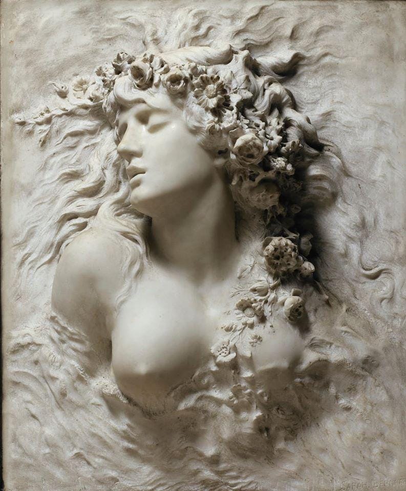 The great French actress Sarah Bernhardt also tackled Ophelia. She was an accomplished sculptor and around the time of a visit to Denmark in 1880, she completed the marble sculpture of Ophelia shown below, which was first exhibited during her American tour in 1881-82. She remained morbidly fascinated by death throughout her life, preferring tragic roles like La Dame aux Camélias, Tosca, Joan of Arc, Cleopatra, Ophelia - and Hamlet no less! She usually died in the final act.