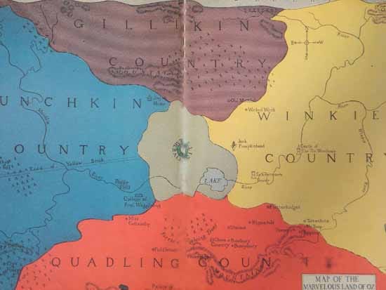 It is not exact, because yellow has moved to the center and replaced by white. Even so, blue Munchkinland can be Shandong and eastern China, purple/black Gillikinland is Manchuria, the Winkie Country is western China with its yellow/white dust landscapes and the Quadling Country is the red earth of southern China. This design accords with the Wuxing 五行 (Five Phases) and the Buddhist concept of a mandala (and Baum’s Theosophist beliefs) in the division of nature, which is why the Emerald City is in the center.