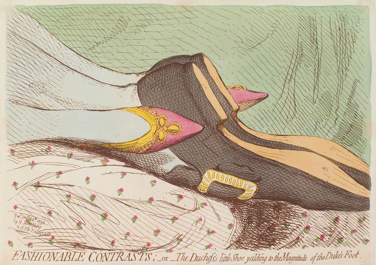 The title is Fashionable Contrasts;—or—The Duchess's little Shoe yeilding to the Magnitude of the Duke's Foot (1792). While the explanation itself is interesting (it satirized the sycophancy of the press), the image is so arresting it that transcends it.