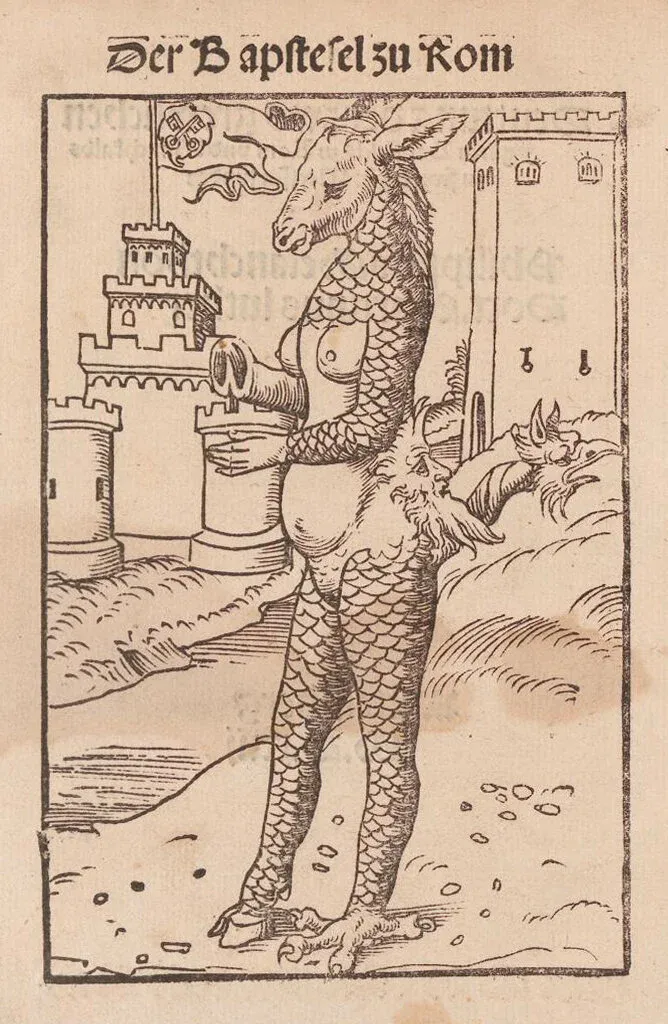 Why are hybrid monsters always of interest to the public? Back in 1496, this sexy monster appeared during the papacy of Rodrigo Borgia, better known as Alexander VI. He was notorious for libertinism and nepotism and for being the father of Cesare and Lucretia Borgia. But it was later popes like Julius II ("the Warrior Pope") and Leo X who drew attacks from Erasmus, Calvin, Luther, Melanchthon and others. Some of them even promoted the colorful idea - an effective idea - that the Popes were the Antichrist and the Catholic Church was the Whore of Babylon.