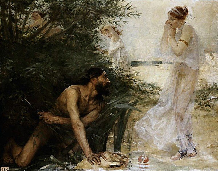 This is by French caricaturist and painter Jean Veber: Ulysses and Nausicaa (1888).