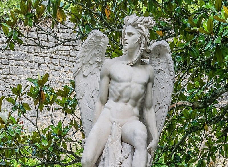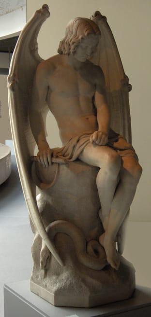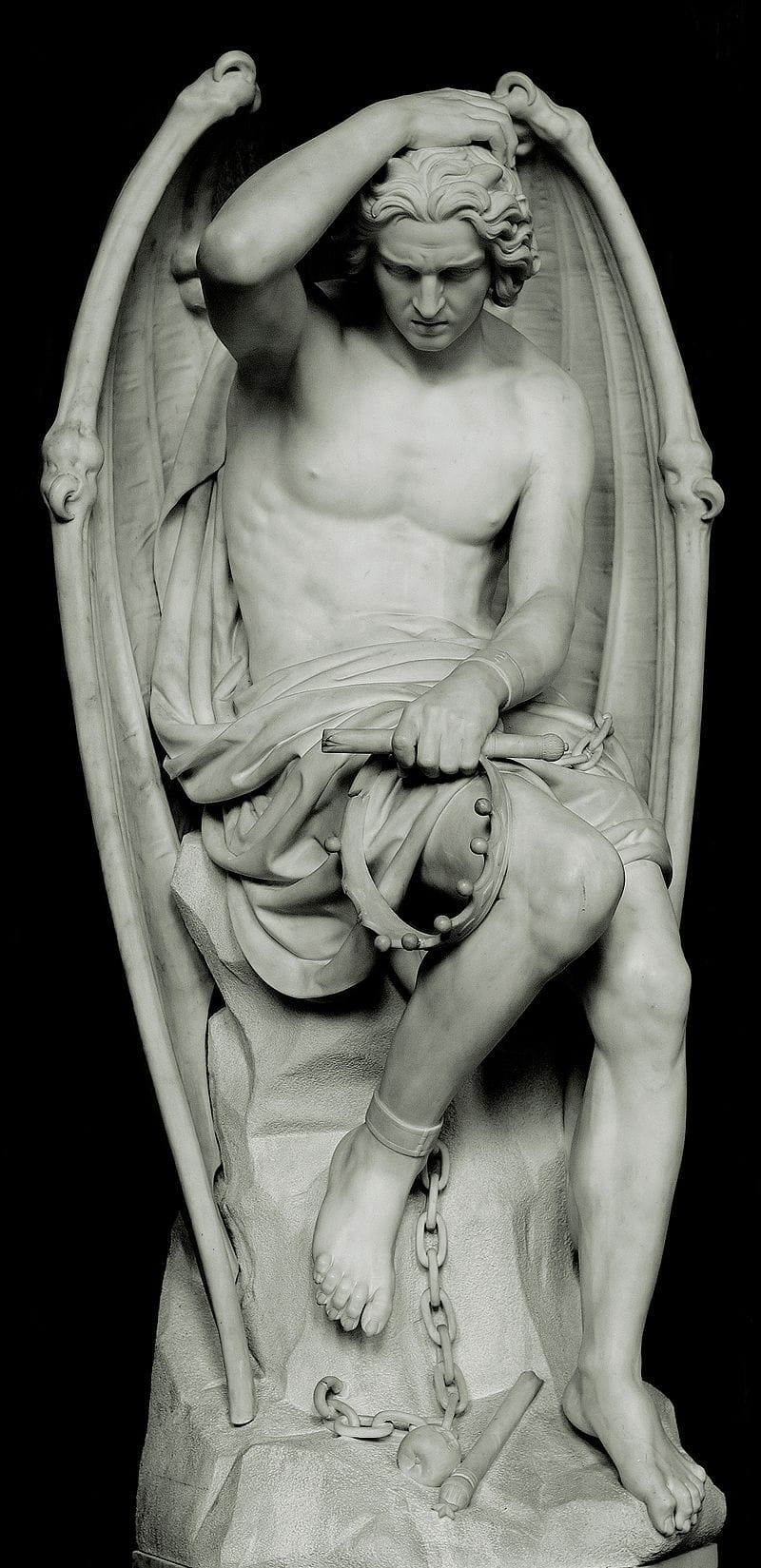 The other images shown here are of marble statues of Lucifer as a fallen angel. The top one has various names including L'ange du mal (Angel of Evil), full version shown below. It replaced an even sexier coy version of that name by the sculptor's brother, which was apparently distracting the girls in church, and it had to go (it's shown at bottom).