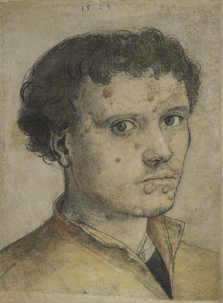 That epidemic in Italy in the 1490's significantly impacted all the powerful families (the Borgias, Sforzas, etc.) and the clergy. Unfortunately, subsequent European exploration conveyed the disease to the rest of the world. Below is Hans Holbein the Younger's Head of a Young Man (1523). Most art historians suspect the man has syphilis; a few argue it's something else.