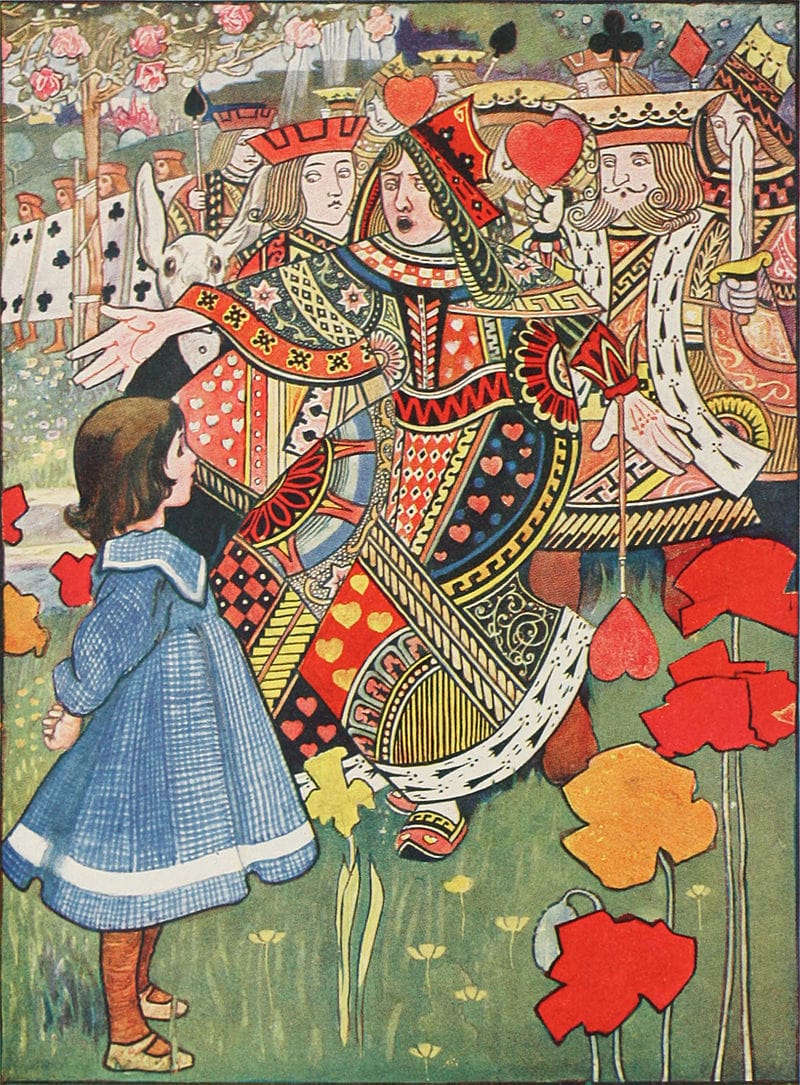 Above is a lithograph for Alice in Wonderland by American illustrator Jessie Willcox Smith in 1923. Below are "Off with her head!” and the book cover by English illustrator Charles Robinson for the 1907 edition.