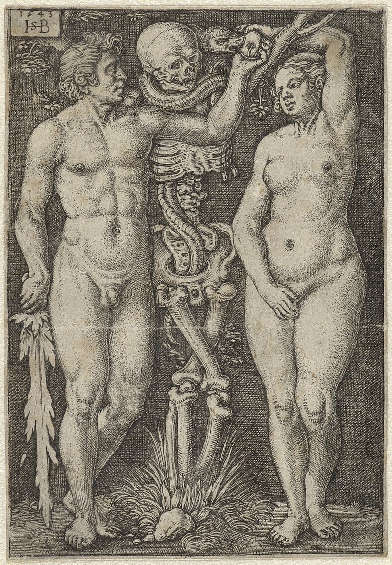 I also like this image by another German artist Sebald Beham from 1543, where the serpent appears to be accompanied by Death himself. No fig leaves either.