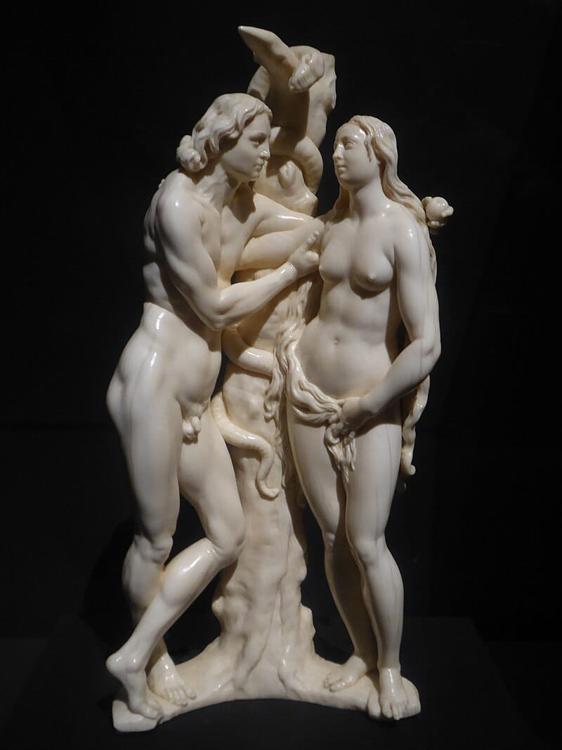 The explicit erotic content in Renaissance paintings, especially in Germany, suggests that Church teachings were already eroding and allowing sex without sin back into the interpretations of Genesis and Exodus. If Eden was the womb and the river out of Eden was the umbilical cord, and Exodus was the journey after leaving the womb, crossing the Red Sea, with its hint of blood, then it was hard to escape the idea that women were the life force itself, and that this was not sinful at all (more here). For example, this is German sculptor Georg Petel's The temptation of Adam and Eve from 1627.