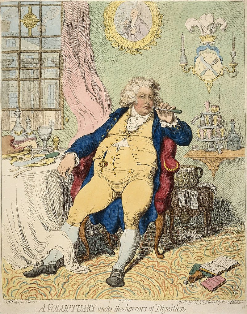 Below is George, Prince of Wales (later George IV), who led an extravagant lifestyle that invited Gillray's satire. The title is exquisite: A Voluptuary Under the Horrors of Digestion.