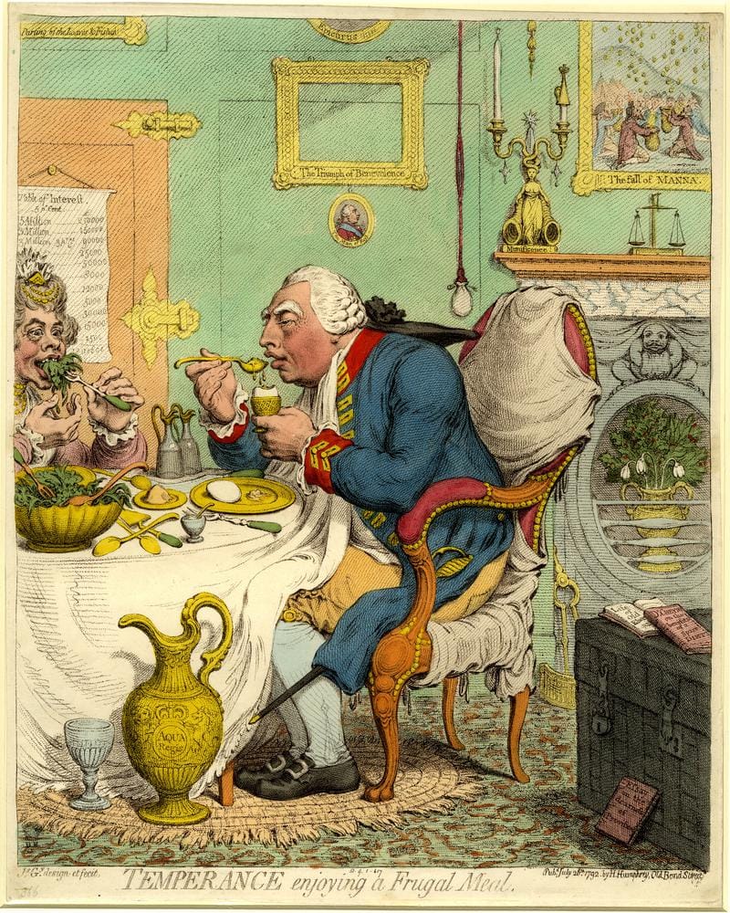 On the other hand, the King himself, George III, was often accused of miserliness. Here he is eating only a boiled egg in a caricature from the same year.