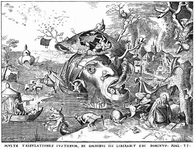 Below is Pieter Bruegel the Elder’s preparatory drawing for his own version in 1556. That's St. Anthony bottom right, ignoring the distractions:
