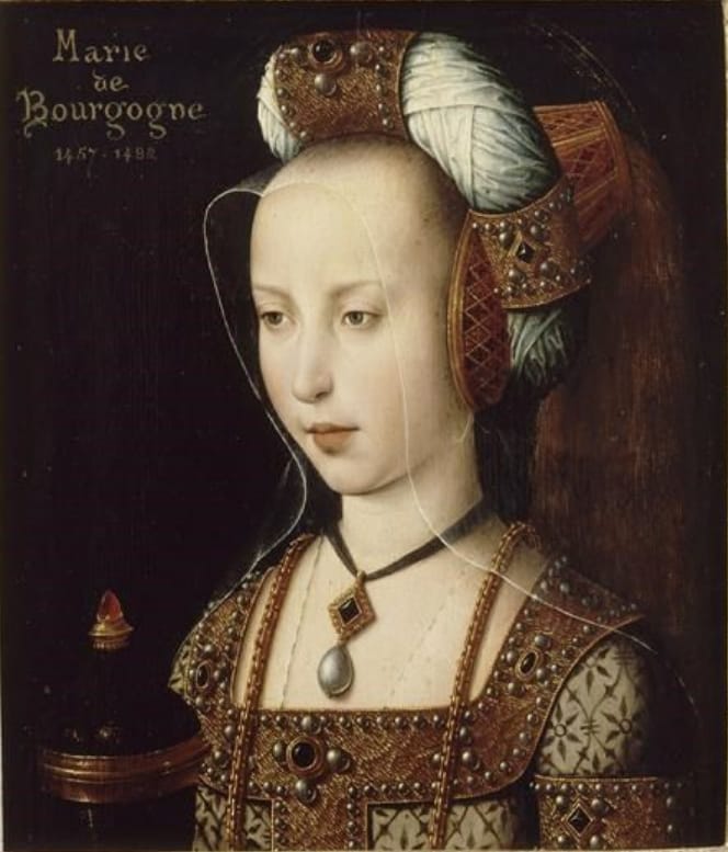 The 15th century saw a tremendous growth in the textile industries, like silks from Italy and wools and linens from Flanders. It led to greater experimentation and extravagance, and not just in headdresses - longer sleeves and gowns, cloaks, hoods and hats, boots... Below is Margaret of Austria, Duchess of Savoy as Mary Magdalene holding an ointment jar. She held the important role of regent or governor of the Habsburg Netherlands. Her hennin is enhanced by a jeweled padded roll, and a veil.