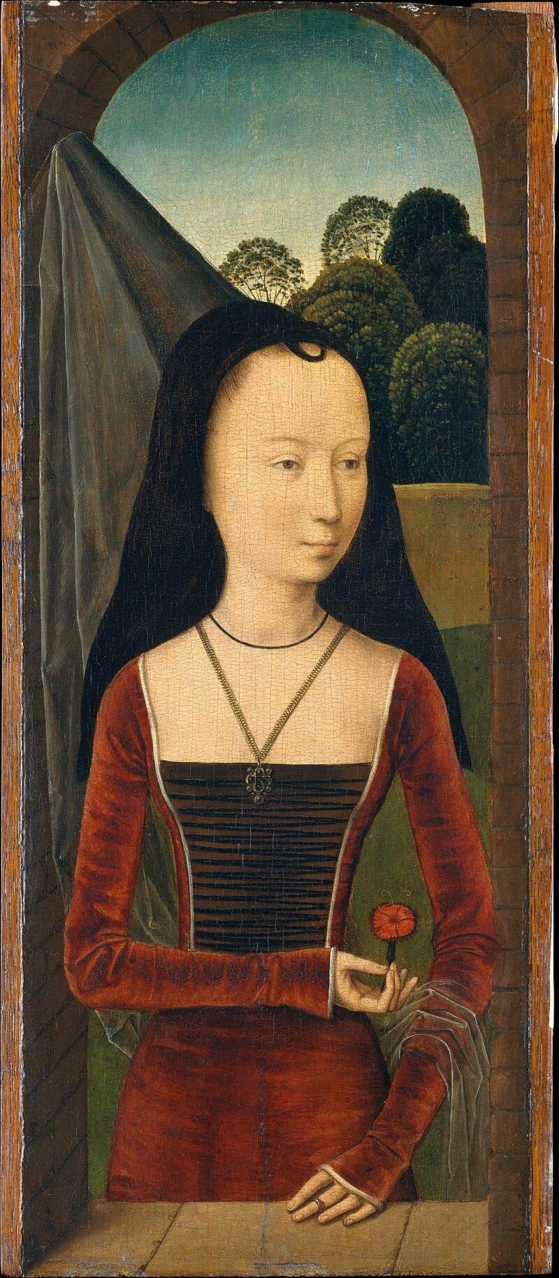 Below, the young woman's hennin is in the shape of a pointed cone, like a church steeple. Draped over it are long strips of gauze or silk. The red ("pink") flower suggests she is about to be married.