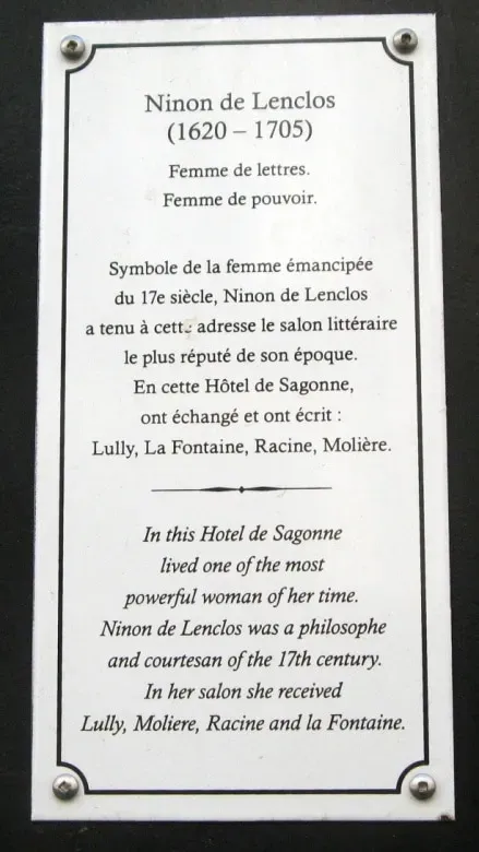 The influential courtesan and intellectual Ninon de Lenclos held her salon from 1667 onwards in the Hôtel de Sagonne at 36, rue des Tournelles, in the Marais district, where she lived for 48 years. It is also where she died, in 1705. The building is still there although now it is nondescript apartments and it cannot be visited. There is this though: