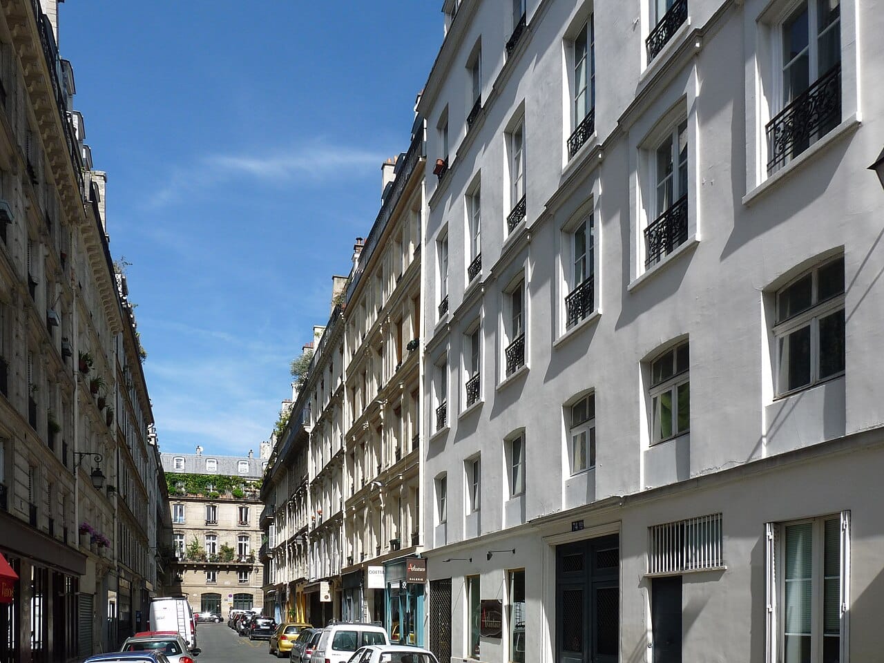 This area was home at the time to many aristocratic hôtels, or, more specifically hôtels particuliers, meaning mansions or townhouses, and not really "hotels" as we know them today, although their (usually absent) owners allowed guests to stay. Of those that remain in central Paris, most are now either official residences, museums or luxury apartments. This is rue des Tournelles today: