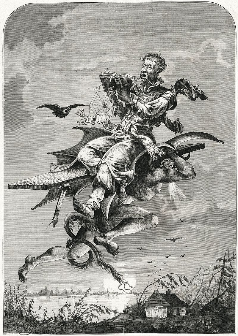 Another was Pan Twardoski, a very popular figure in Polish folklore. He thought he could outwit the Devil by inserting a clause into the contract that he would only give up his soul if he died in Rome, and he had no intention of going there. The Devil catches him out when Twardowski stays at an inn called Rzym (which is "Rome" in Polish). Here he is on his way to Hell:
