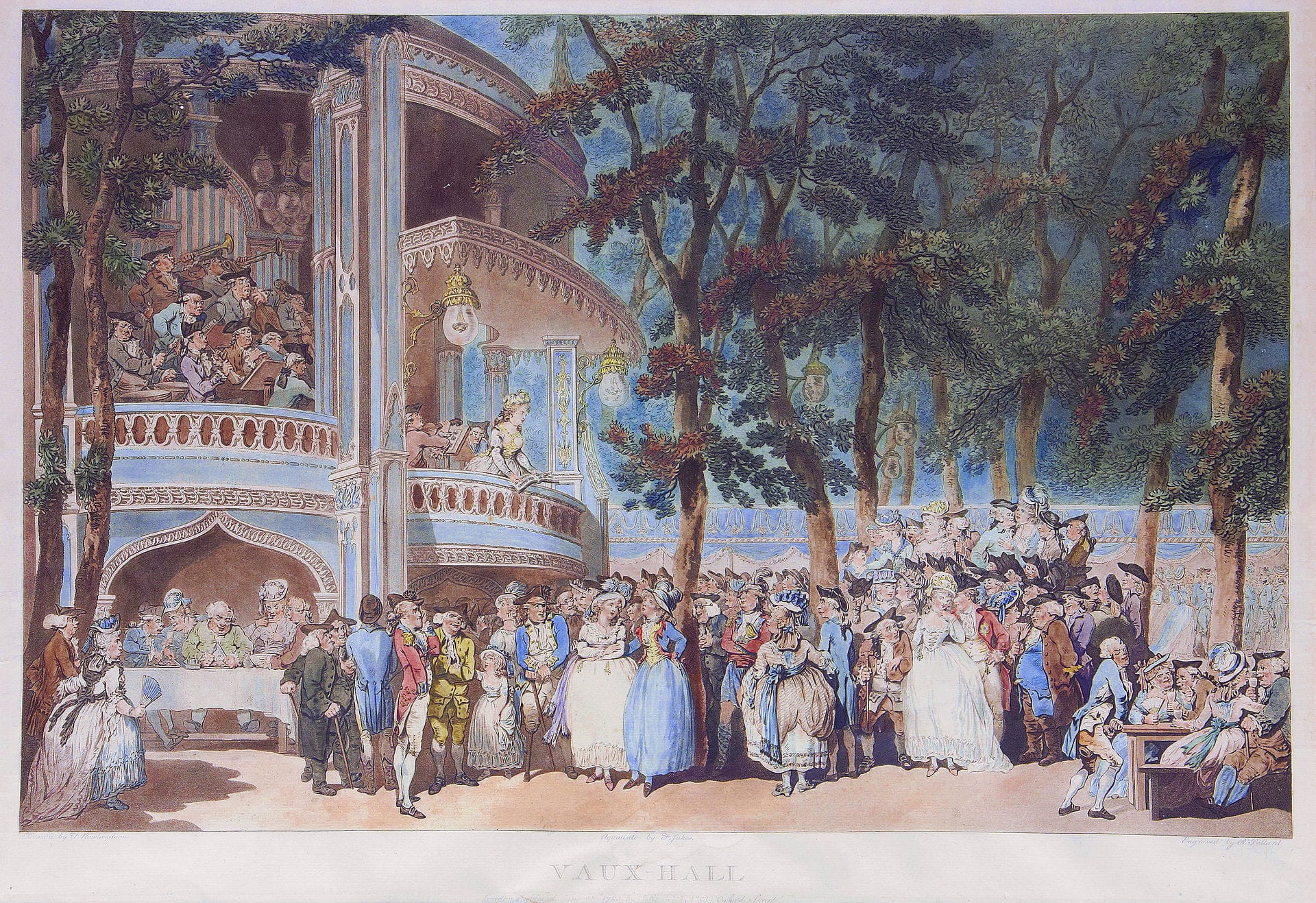 Caricaturist Thomas Rowlandson drew the Gardens in 1785 (below). The man seated at the table on the left is Samuel Johnson, with James Boswell and Oliver Goldsmith.