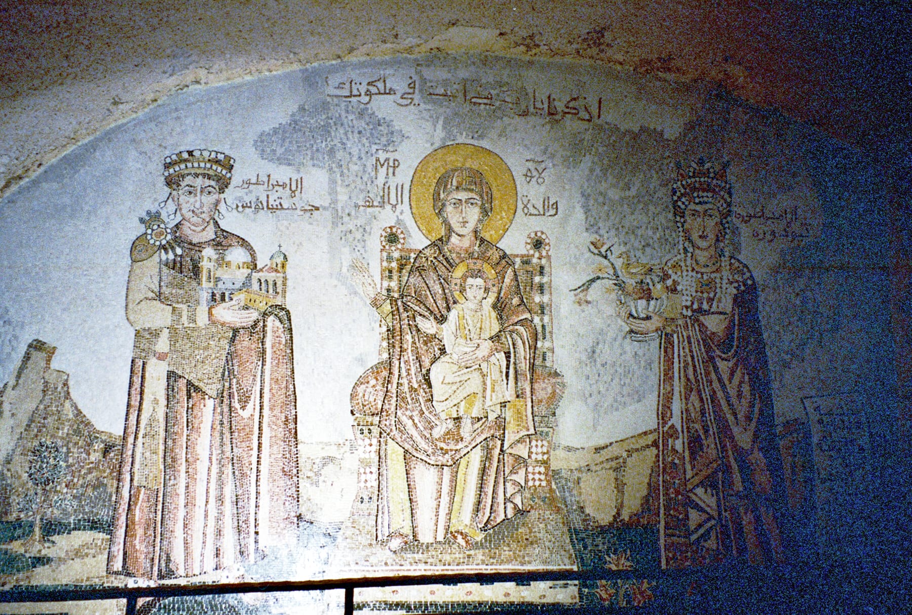 The mosaic below is at the Convent of Our Lady of Saidnaya in Syria, with Emperor Justinian on the left, the Virgin Mary in Theotokos pose, and Empress Theodora on the right. The Convent was likely founded by Justinian also around 547, following two visions of Mary.