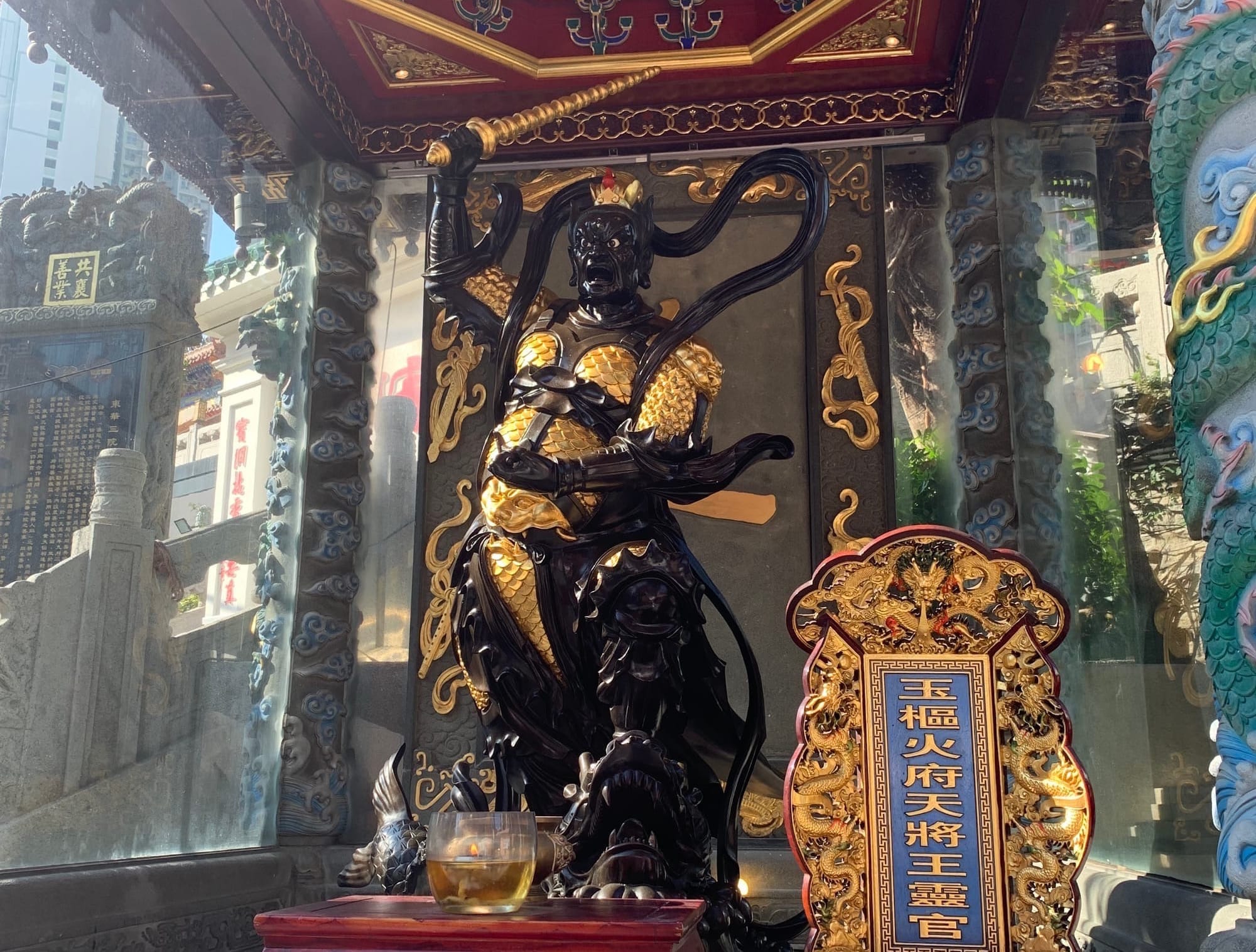 Consider also his resemblance to this guardian deity from the Taoist Wong Tai Sin Temple in Hong Kong. This is one of the Four Heavenly Kings, Zēngzhǎng Tiānwáng, the King of the South.