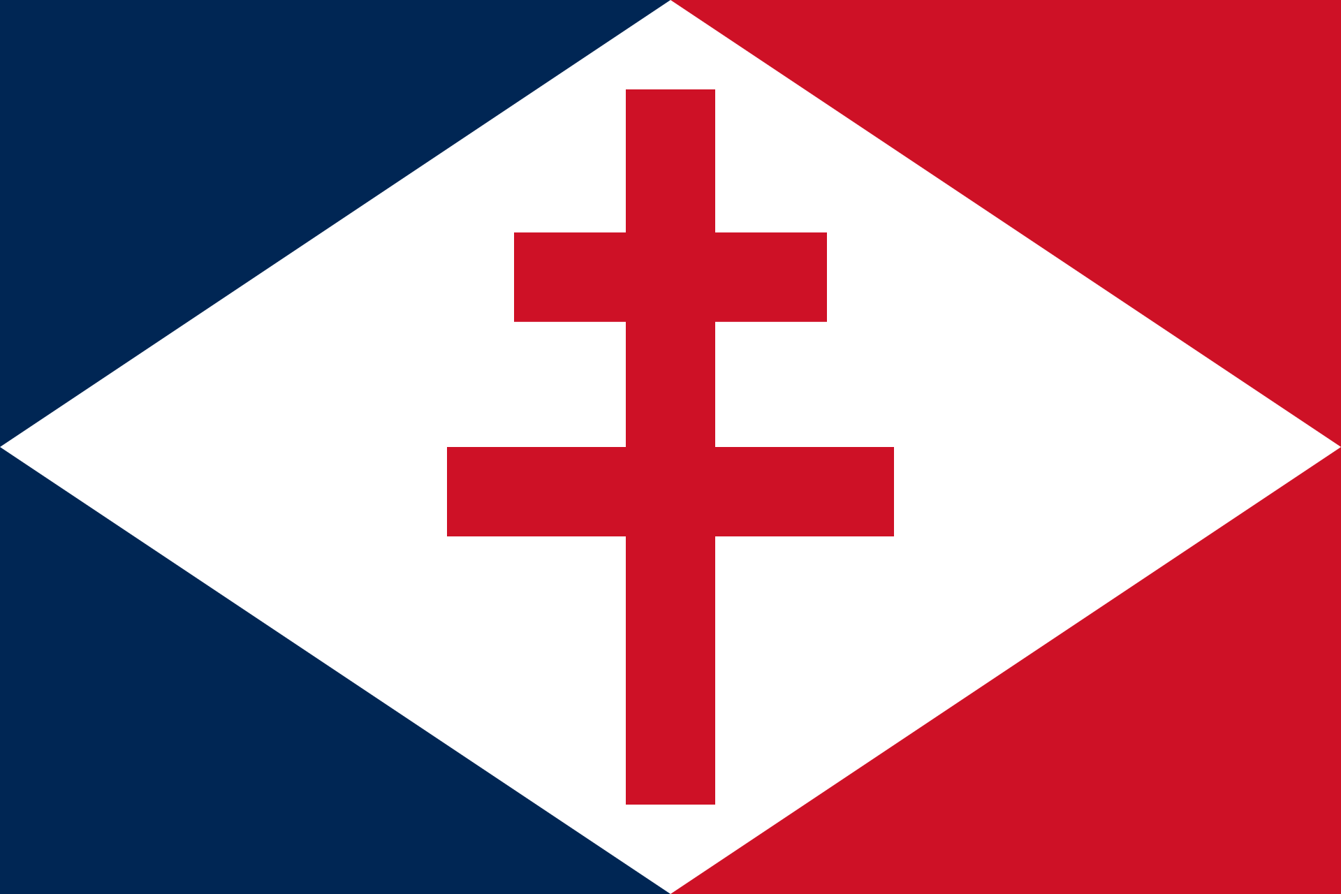 The flag of Free France, shown above, contains the Cross of Lorraine, also known as the Cross of Anjou. Why Lorraine? Because - as with Joan of Arc - it symbolized the lost provinces of France, on this occasion lost to Germany after 1871. It was the only official flag that Free France used before becoming the Government of the French Republic in 1944. Below is the naval version: