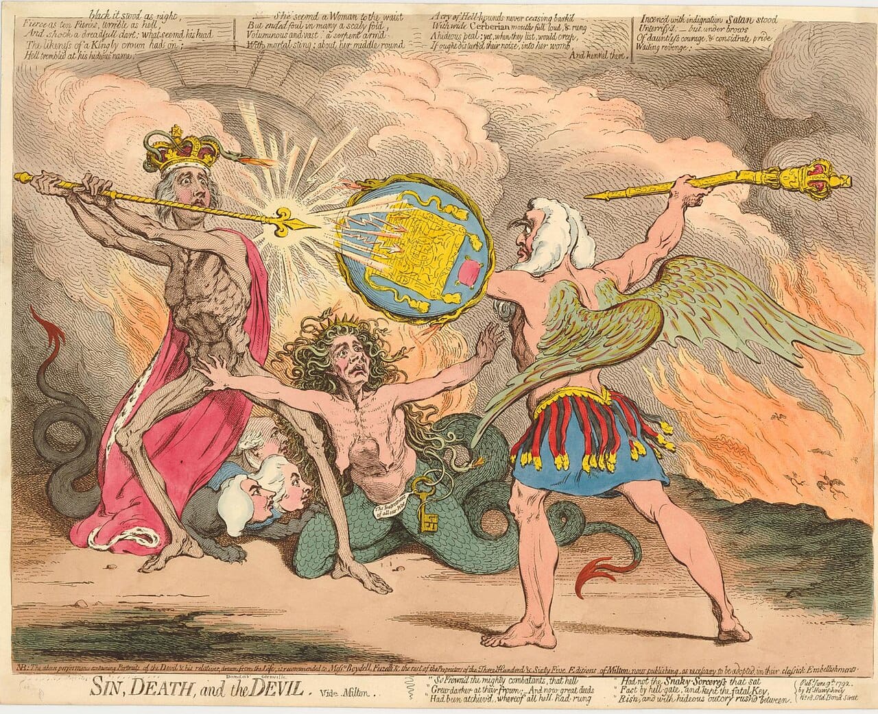 Not long before Blake's painting, the political satirist James Gillray made use of Milton in the infamous 1792 caricature below, which shows the Queen in the middle (Sin), protecting Prime Minister Pitt (Death), with the King's crown on, from an irate Chancellor Thurlow (Satan):